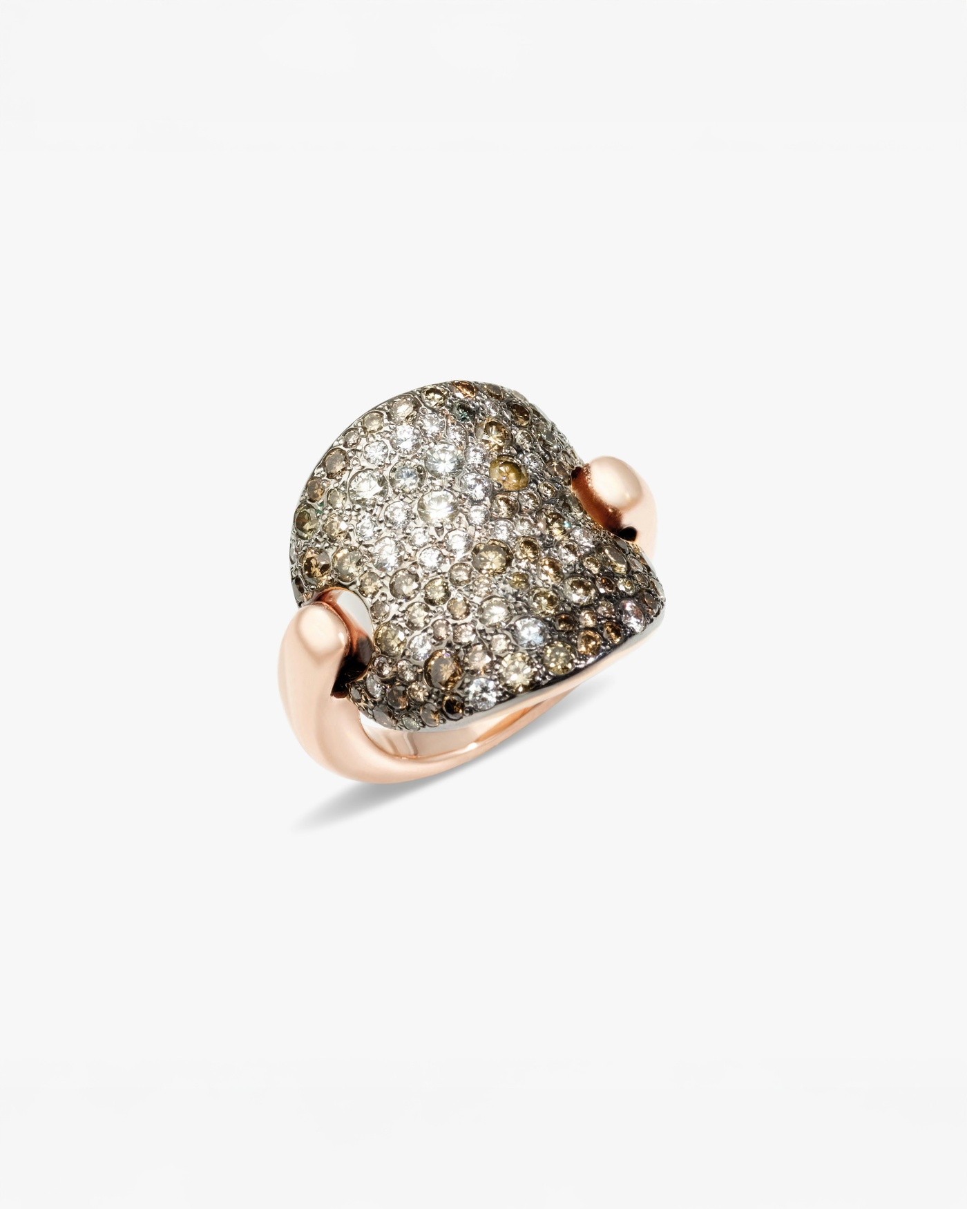 Sabbia, named after the Italian for sand, is one of Pomellato’s most famous designs that dares to present diamonds in a new light with Milanese sophistication. Pomellato’s irregular pavés celebrate the beauty of Nature with diamonds set by hand in organic patterns as random as the shifting shapes of sand. This ring in rose gold presents different-sized white and brown diamonds skillfully set on an uneven surface: a signature of Pomellato extraordinary craftsmanship.