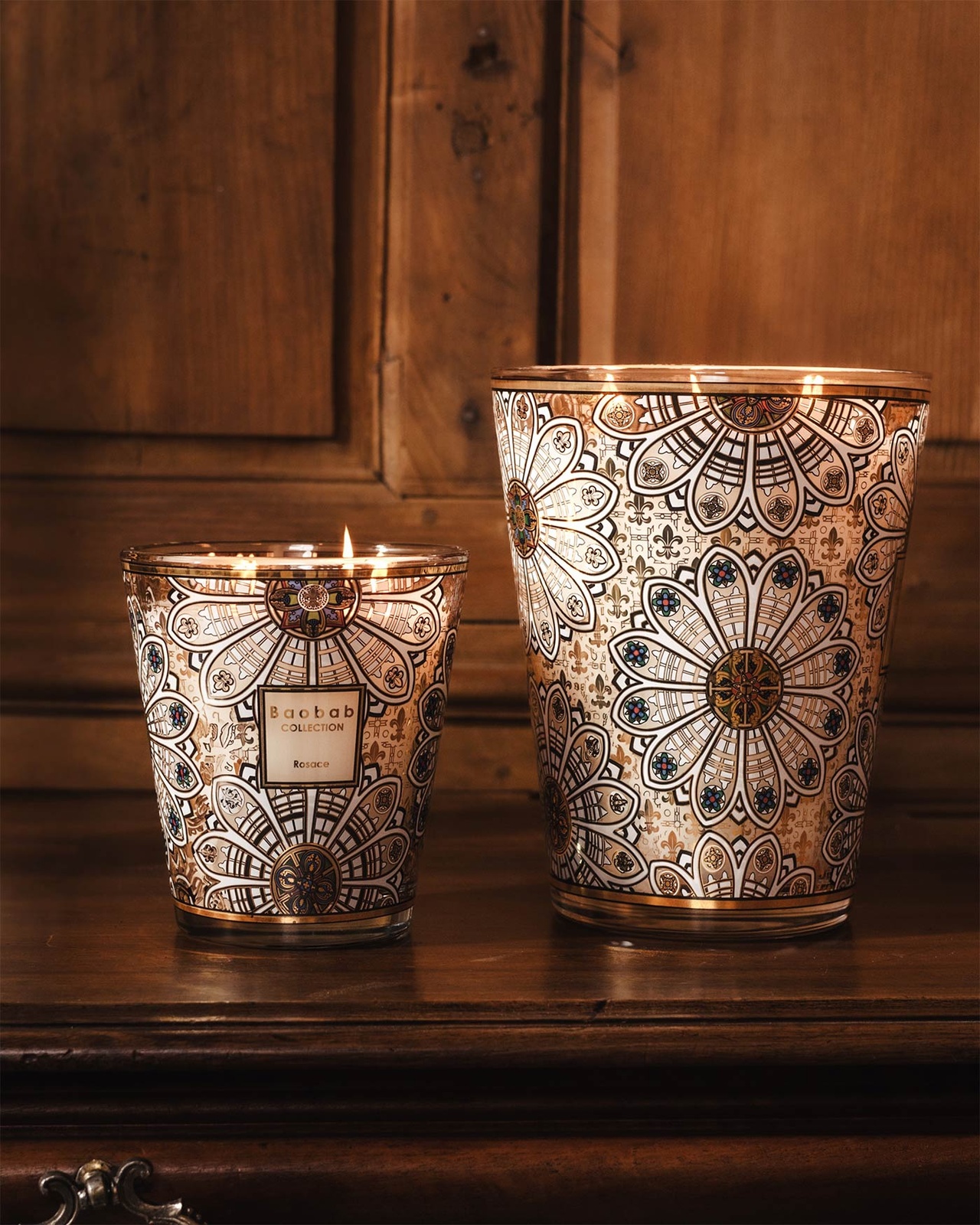 The Rosace candle pays tribute to Gothic architecture and the spiritual light of cathedrals. Its glass is covered with a precious silk-screen print, where gold and subtle colors draw motifs inspired by medieval rose windows. Like luminous lace, this refined décor is set against a background of fleur-de-lis, an emblem of nobility and purity.