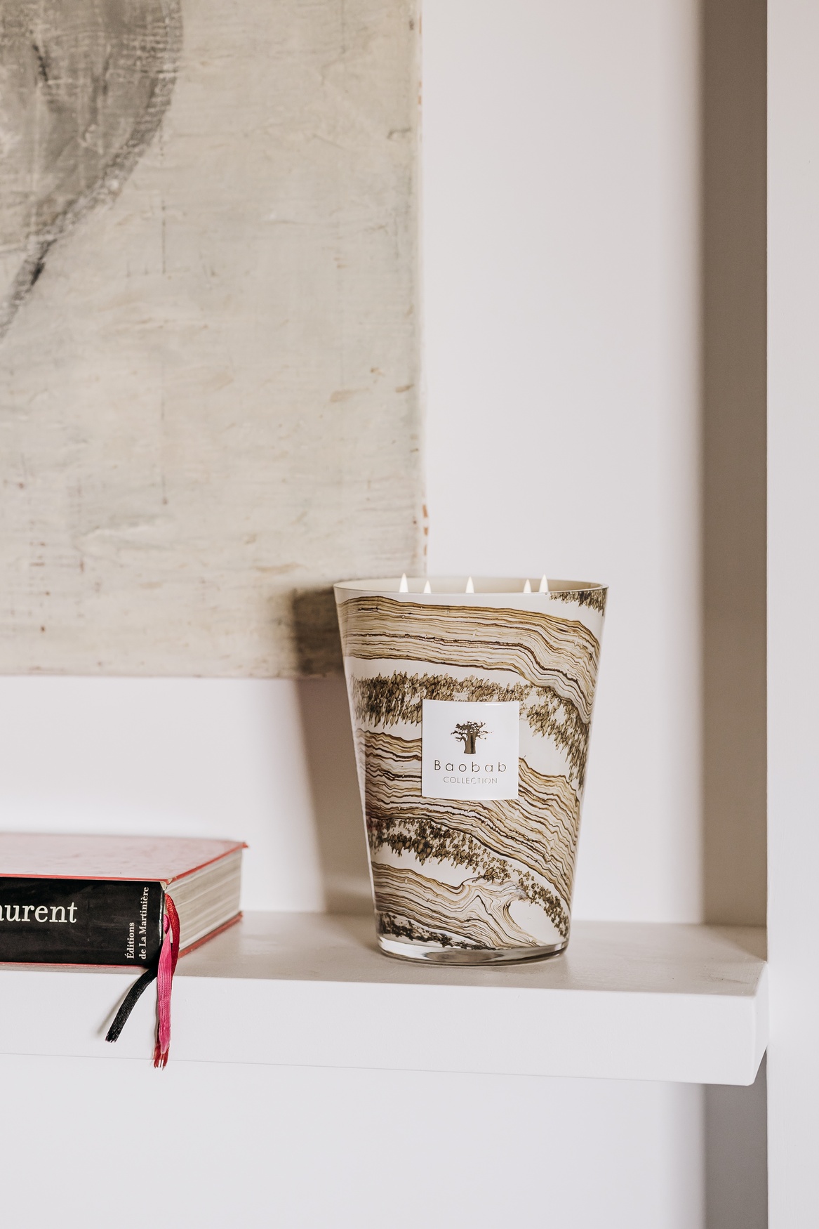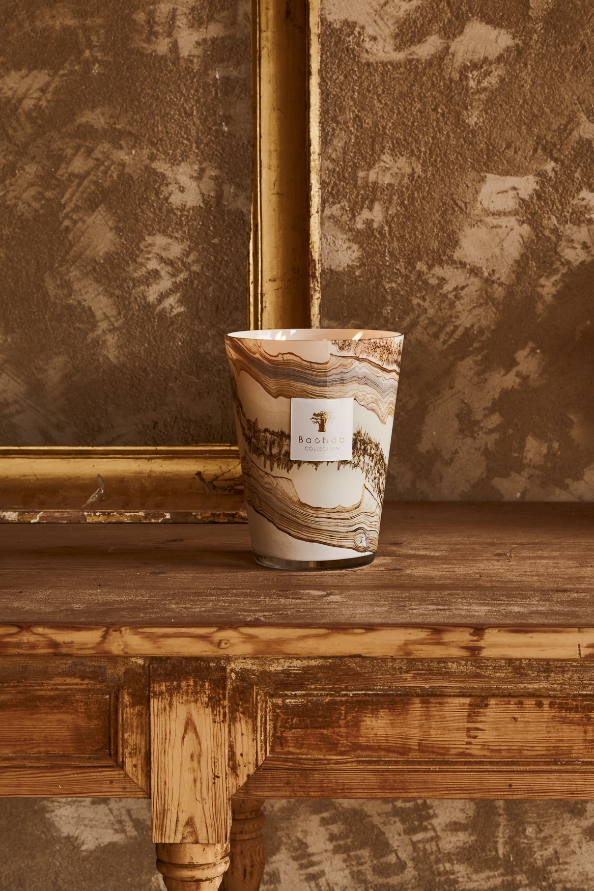 The hand-blown glass of Siloli candles features shades of beige and brown, with horizontal lines formed by small, random organic spots. Each glass is unique, as the sandy color dissolves into the material according to the glassblower's breath.