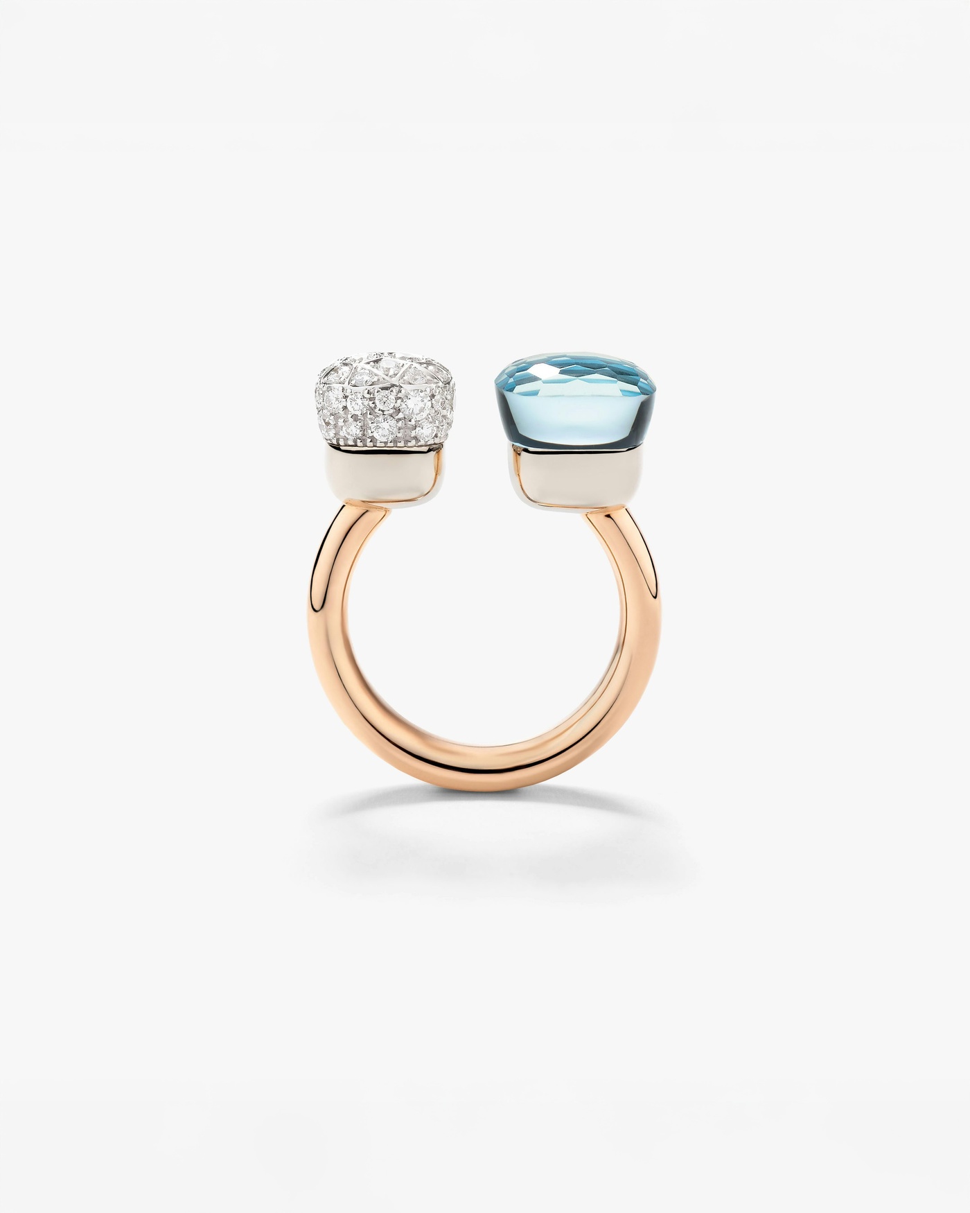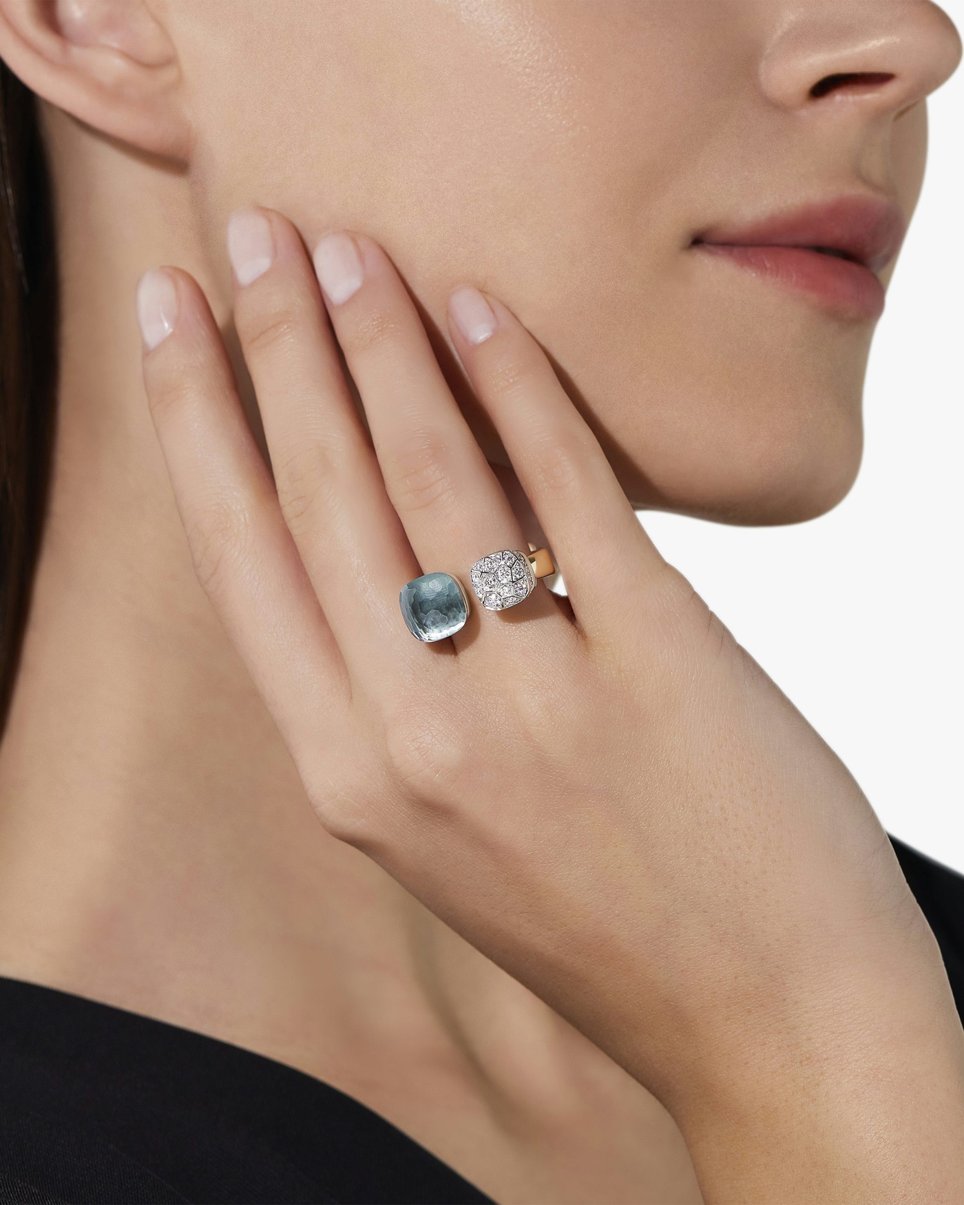 Nudo is quintessentially Pomellato and its bold silhouette has become the most iconic design of the house. With the revolutionary idea to free the gem from the bezel and present its naked splendor, every facet of Nudo’s gemstones evoke Pomellato’s unique spirit and the understated elegance of Milan. The new Nudo toi et moi rings are a symbol of the union between nature and the art of Pomellato crasftsmanship. Combining the vibrant sky blue topaz in Classic size with the silhouette of the Nudo Petit covered in a diamond pavé. The toi et moi rings are bold enough to wear individually or easily composed into a colorful stack to create a graphic mosaic of color and diamonds.